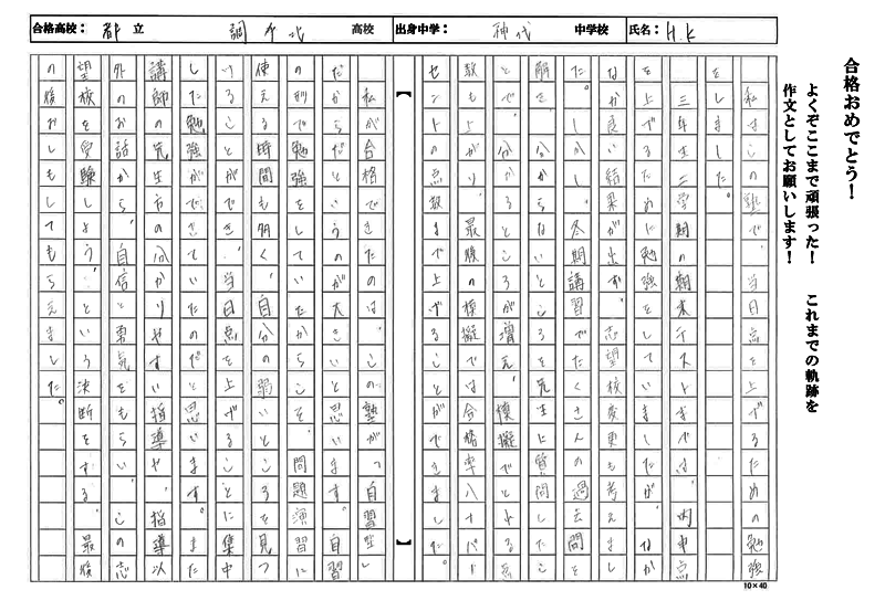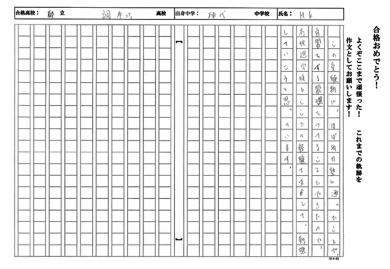 この受験期に、ほぼ毎日塾に通ったことで自習をする習慣をつけることもできたので、高校進学後もここでの経験を活かして、勉強していこうと思っています。