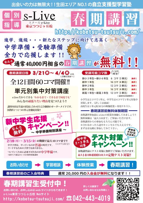 ~新中学生応援キャンペーン~ なんと無料の1ヵ月間中学準備講座!! s-Live東京つつじヶ丘校