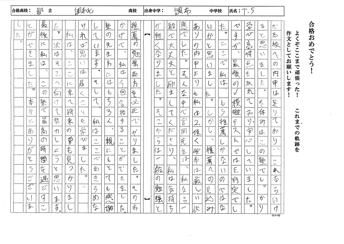 私は、最初志望校を都立駒場高校を考えていました。ですがV模試ではE判定でした。そこで私は、志望校を下げることを決断しました。それからは、自分の志望校をどこにするかすごく悩みました。やっとのことで選んだ高校への内申は足りており、これならいけると思いました。冬休みはこの塾でしっかり学び高得点も取れており安心していました。ですが、最後のV模試テストではE判定でした。ここで私は、もう推薦しかないのではないかと思いました。しかし、推薦への見込みありの内申よりも私は2低く確率は厳しい状態でした。そんな中で宮岡先生は、私なら一般で大丈夫と励ましてくださり、私は気持ちが軽くなりました。そこから一般の勉強と推薦の勉強両方を必死でやりました。そのおかげで、私は今回合格することができました。塾の先生方にはもちろん、親にもとても感謝しています。そして、私はここで諦めなければ思いは届くことを学びました。