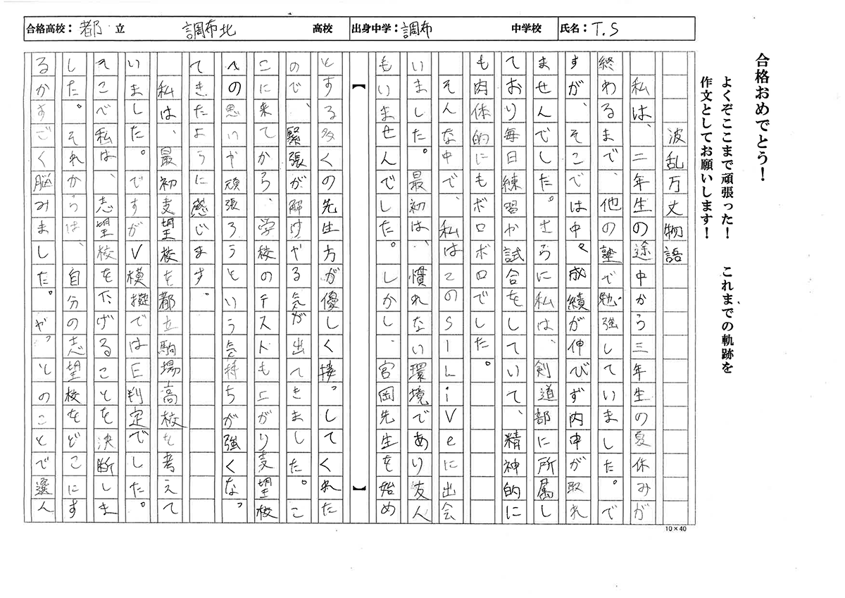 そんな中で、私はこのs-Liveに出会いました。最初は、慣れない環境であり友人もいませんでした。しかし宮岡先生を始めとする多くの先生方が優しく接してくれたので緊張が解けやる気が出てきました。ここに来てから、学校のテストも上がり志望校への思いや頑張ろうという気持ちが強くなってきたように感じます。